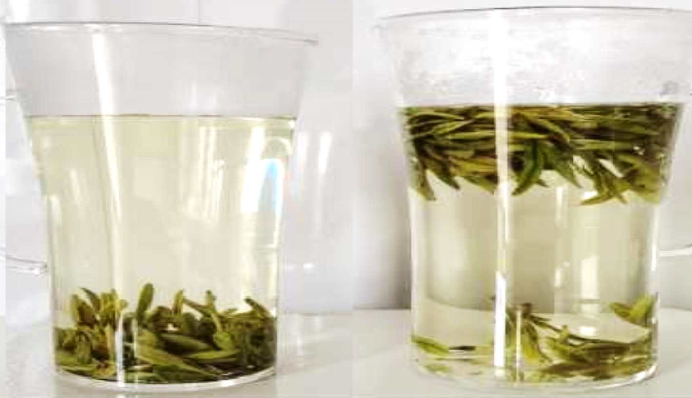 左:本成果所制龍井茶很快下沉右:傳統(tǒng)機制龍井茶很難下沉