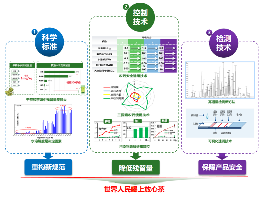 針對茶葉泡飲的主要消費方式,基于沖泡進入茶湯中的風險物質才可能對飲茶者健康造成風險,重構了“有效風險量”決定茶葉中MRLs制定的國際規范;依據農藥轉移規律、農藥理化性質和毒理學性質,研發了安全選用技術,用于篩選茶園適宜低風險農藥;基于茶葉中S421、9,10-蒽醌的轉移和污染路徑,研發了源控制技術。