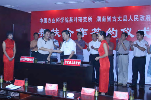 2007年7月22日,早早從各鄉鎮趕到古丈縣城的茶葉公司老總、種植大戶和茶農代表,共同見證了我所所長楊亞軍研究員和湖南省古丈縣人民政府縣長代表雙方簽訂的幫扶合作協議。今后,我所將在茶葉產業發展規劃、茶葉生產和加工技術、骨干技術人員培訓和信息服務等方面對古丈縣的茶葉產業化建設開展幫扶,提升當地茶葉生產的科技水平,促進西部貧困地區的經濟建設。