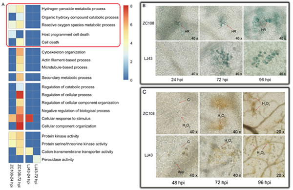 圖 1 炭疽菌接種 ZC108 和 LJ43 后,茶樹葉片 HR 和 H2O2 的響應