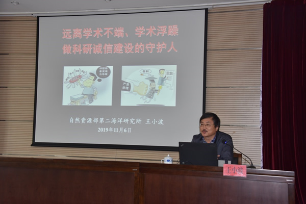 為引導(dǎo)我所科研人員遵守學(xué)術(shù)規(guī)范、堅守科研誠信,摒棄學(xué)術(shù)不端行為,建設(shè)誠信科研的良好學(xué)術(shù)環(huán)境,11月6日,所紀委邀請自然資源部第二海洋研究所紀委書記王小波來所作《遠離學(xué)術(shù)不端和學(xué)術(shù)浮躁,做科研誠信建設(shè)的守護人》專題報告。全所科研人員、研究生共200余人參加報告會。