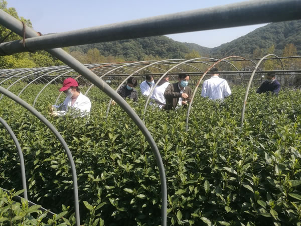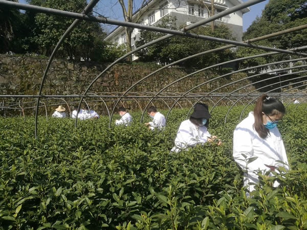 在了解到龍冠公司因疫情影響而面臨采茶工短缺的困難后,研究所向全體職工發出積極投身茶葉生產,助力企業復工復產的號召。茶深加工與多元化利用團隊黨支部全體黨員積極響應號召,主動與龍冠公司對接,在做好疫情防控的同時開展義務采摘,助力龍冠公司盡快恢復生產。