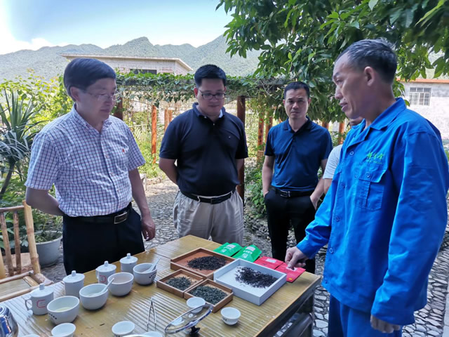 在將軍峰茶業(yè)集團(tuán)馬圣茶廠,魯成銀副所長(zhǎng)現(xiàn)場(chǎng)審評(píng)了昭平紅茶、昭平綠茶等系列茶葉產(chǎn)品,與技術(shù)人員進(jìn)行交流,提出了技術(shù)改進(jìn)的意見和建議。在蕭賀古道茶業(yè)公司,考察了紫芽茶種苗繁育基地,現(xiàn)場(chǎng)審評(píng)了以紫芽茶為原料加工的紅茶樣品,指出要加快紫芽茶這一特異品種的選育,盡快申請(qǐng)植物新品種權(quán)保護(hù)和品種登記。