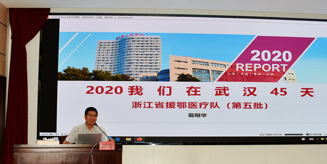 葛明華院長以“2020 我們在武漢45天”為題,從“救治患者是使命、保護戰友是根本、科技攻關是必須、弘揚正氣亦擔當”四個方面生動地講述了援鄂醫療隊在武漢45天抗疫歷程,讓廣大職工、研究生更加直觀生動地了解了抗疫一線戰“疫”降“魔”、愛國奉獻、服務人民的感人場景,讓與會人員接受了一次很好的精神洗禮。