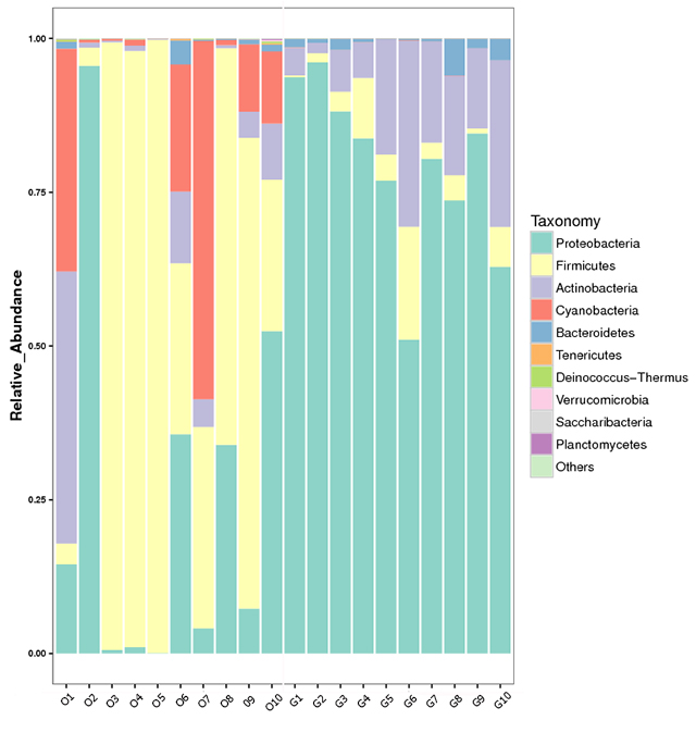 圖2. 茶尺蠖兩近緣種共生菌在門水平上相對豐度。右側(cè)不同顏色方塊代表排名前10的菌落。