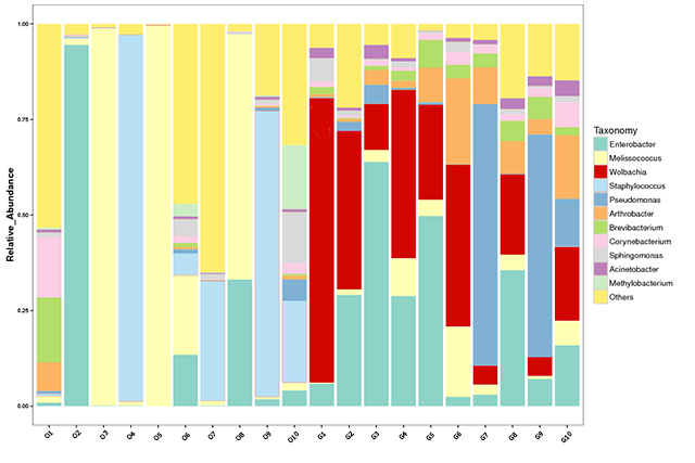 共生菌在調(diào)節(jié)昆蟲生長發(fā)育、免疫及生殖等方面扮演了重要角色。近日,我所科研人員在昆蟲學專業(yè)期刊Bulletin of Entomological Research發(fā)表題為“Comparative characterization of microbiota between the sibling species of tea geometrid moth Ectropis obliqua Prout and E. grisescens Warren”的研究論文,系統(tǒng)解析了茶尺蠖兩近緣種體內(nèi)共生菌群落的組成與差異,與小茶尺蠖相比,灰茶尺蛾共生菌不僅具有更高的多樣性,而且含有可調(diào)控生殖功能的沃爾巴克菌Wolbachia。該研究為揭示茶尺蠖兩近緣種間的生殖隔離機制提供了重要基礎(chǔ),相關(guān)工作得到了國家自然科學基金和中國農(nóng)科院科技創(chuàng)新工程等項目資助。