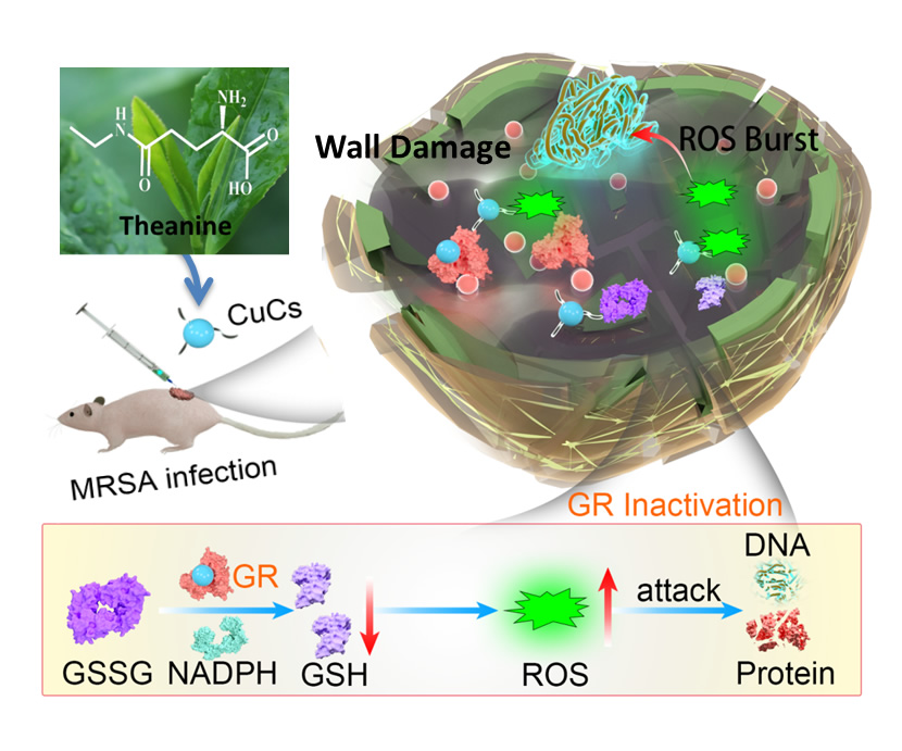 通過進(jìn)一步對其抗菌機(jī)制解析,發(fā)現(xiàn)茶氨酸多肽銅團(tuán)簇不僅可以破壞細(xì)菌壁膜結(jié)構(gòu),使其內(nèi)容物泄露;而且抑制谷胱甘肽還原酶(GR)的活性,導(dǎo)致活性氧(ROS)爆發(fā),過載的ROS不僅能夠攻擊生物大分子,還能夠加速細(xì)菌壁膜結(jié)構(gòu)的破壞,最終導(dǎo)致細(xì)菌死亡。這項(xiàng)工作提出并初步證明了“金屬團(tuán)簇可以通過直接抑制細(xì)菌內(nèi)GR活性來導(dǎo)致ROS升高,最終導(dǎo)致細(xì)菌死亡”這一假說。
