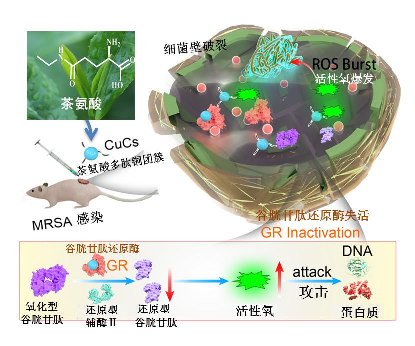 “團隊利用茶樹中天然活性分子茶氨酸為結(jié)構(gòu)單元,設(shè)計功能多肽構(gòu)建了具有精確分子組成的茶氨酸多肽銅團簇,能夠高效地殺傷耐甲氧西林金黃色葡萄球菌,對因此引起的小鼠皮膚感染和敗血癥感染有良好的治療作用,其治療效果與臨床用藥莫匹羅星和萬古霉素相當。”論文通訊作者魯成銀研究員說。