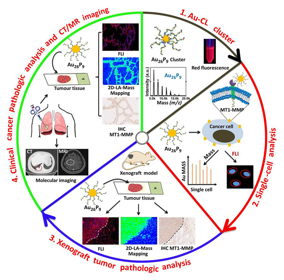 針對這個難題,經過幾年的探索,張相春所在團隊建立了一種精確的基于貴金屬團簇的可視化定量方法,通過對原發瘤組織切片上腫瘤侵襲蛋白MT1-MMP的表達量定量檢測來評估原發瘤的轉移風險。他制備了一種含26個金原子發紅色熒光的Au-CL團簇,并且該團簇可以特異的標記在MT1-MMP蛋白上。通過對原發瘤組織切片上MT1-MMP蛋白的熒光定性和質譜定量分析,實現了對原發瘤的轉移風險進行了準確的評估,有望為臨床醫生對原發瘤病人選擇合理的治療方案,提高腫瘤患者的生存率和生存質量提供依據。更重要的是這種新的分析方法被臨床上的分子影像學CT/MRI和傳統病理學蘇木精/尹紅(H&E)/IHC/IF等方法所證實。相關系列研究發表在國際知名期刊ACS Nano和Small上。