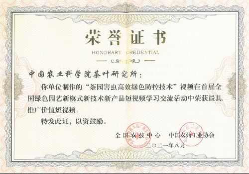 近日,全國農(nóng)技中心會(huì)同中國農(nóng)藥工業(yè)協(xié)會(huì)聯(lián)合舉辦了首屆全國綠色園藝新模式、新技術(shù)和新產(chǎn)品(簡稱“三新”)短視頻學(xué)習(xí)交流活動(dòng)。我所制作的“茶園害蟲高效綠色防控技術(shù)”視頻獲“最具推廣價(jià)值短視頻”榮譽(yù)稱號(hào)。