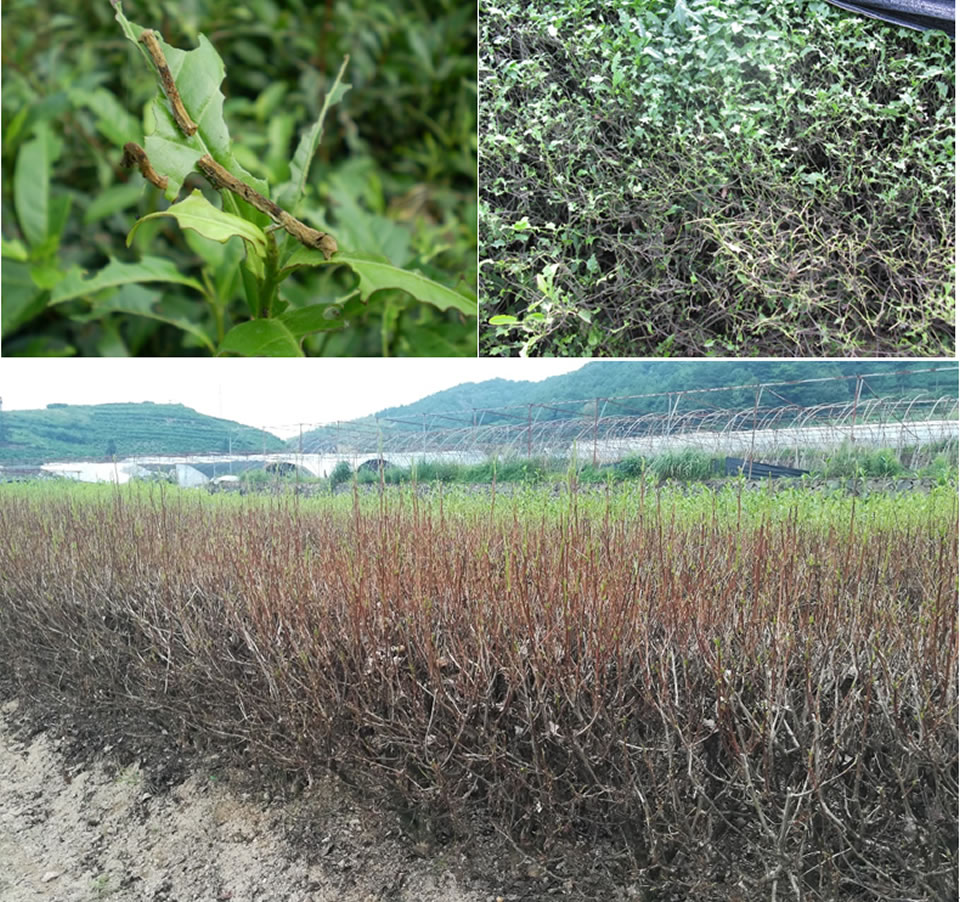 圖1 灰茶尺蠖幼蟲及田間為害狀