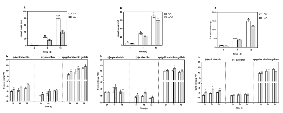 研究人員以此為切入點(diǎn),系統(tǒng)地研究了灰茶尺蠖幼蟲取食為害對(duì)后續(xù)幼蟲生長(zhǎng)發(fā)育、兒茶素各組分含量和多種植物激素含量的影響;在明確差異兒茶素組分可顯著降低灰茶尺蠖幼蟲生長(zhǎng)發(fā)育速率的基礎(chǔ)上,深入探究了多種植物激素信號(hào)途徑在其中的調(diào)控作用。研究結(jié)果表明,灰茶尺蠖幼蟲取食誘導(dǎo)茶樹兒茶素、表兒茶素和表沒食子兒茶素沒食子酸酯含量顯著積累,最終產(chǎn)生直接防御反應(yīng);這一過(guò)程受茉莉酸、乙烯和植物生長(zhǎng)素信號(hào)途徑的共同調(diào)控。該項(xiàng)研究不僅建立了灰茶尺蠖幼蟲模擬取食的標(biāo)準(zhǔn)化方法,而且極大地加深了對(duì)茶樹與灰茶尺蠖互作關(guān)系的理解。