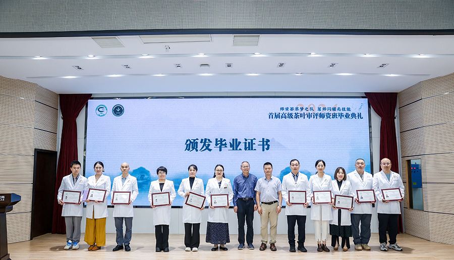 本次師資班畢業典禮現場,設置了“風味鑒別、品質排序、綜合審評、茶品設計”四個項目,全方位、多角度地為首屆高級審評師資班學員們展現了在這一年學習中的學習成果、技能水平與專業風采,老師們為圓滿完成學業的學員頒發了畢業證書,并為優秀學員和優秀班干部頒發了榮譽證書等。