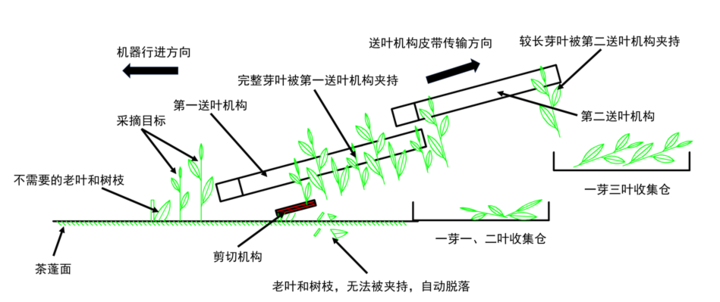 “往復切割式采茶機效率雖高,但采摘中會對芽葉造成傷害,同時會混入其他葉片,導致獲得的茶葉質量較差,且在采摘后無法分類收集,仍需人工或機器分選,不適合名優茶的采摘?!崩顥钫f,他們研發的采茶機適用于一芽二葉及以上的手工優質茶采摘。之所以能成為國內首創,關鍵在于突破了茶葉分級的難點。 “在刀具上方增加了兩組階梯式的輸送帶,可以利用芽葉之間的高度差,實現分級。不僅能將不適合采摘的嫩芽及葉片分離,還能保證經刀片切割后得到的碎葉不會進入到收集倉內?!?/p>