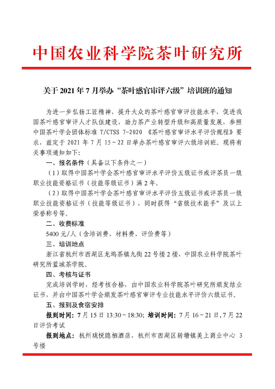 中國農(nóng)業(yè)科學(xué)院茶葉研究所關(guān)于2021年7月15-22日舉辦茶葉感官審評(píng)六級(jí)培訓(xùn)班的通知