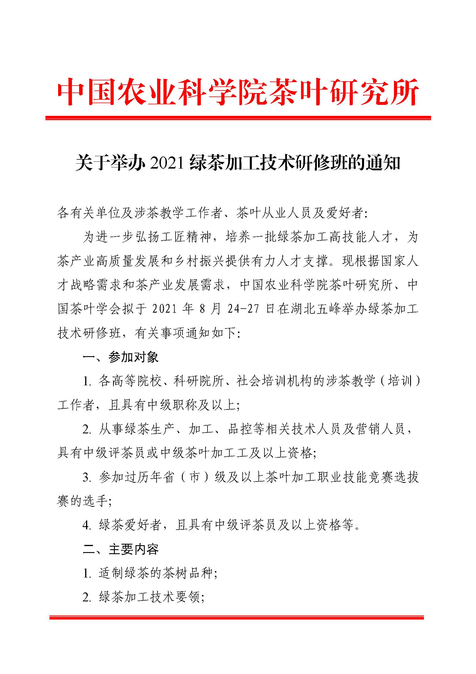 關于舉辦2021綠茶加工技術研修班的通知
