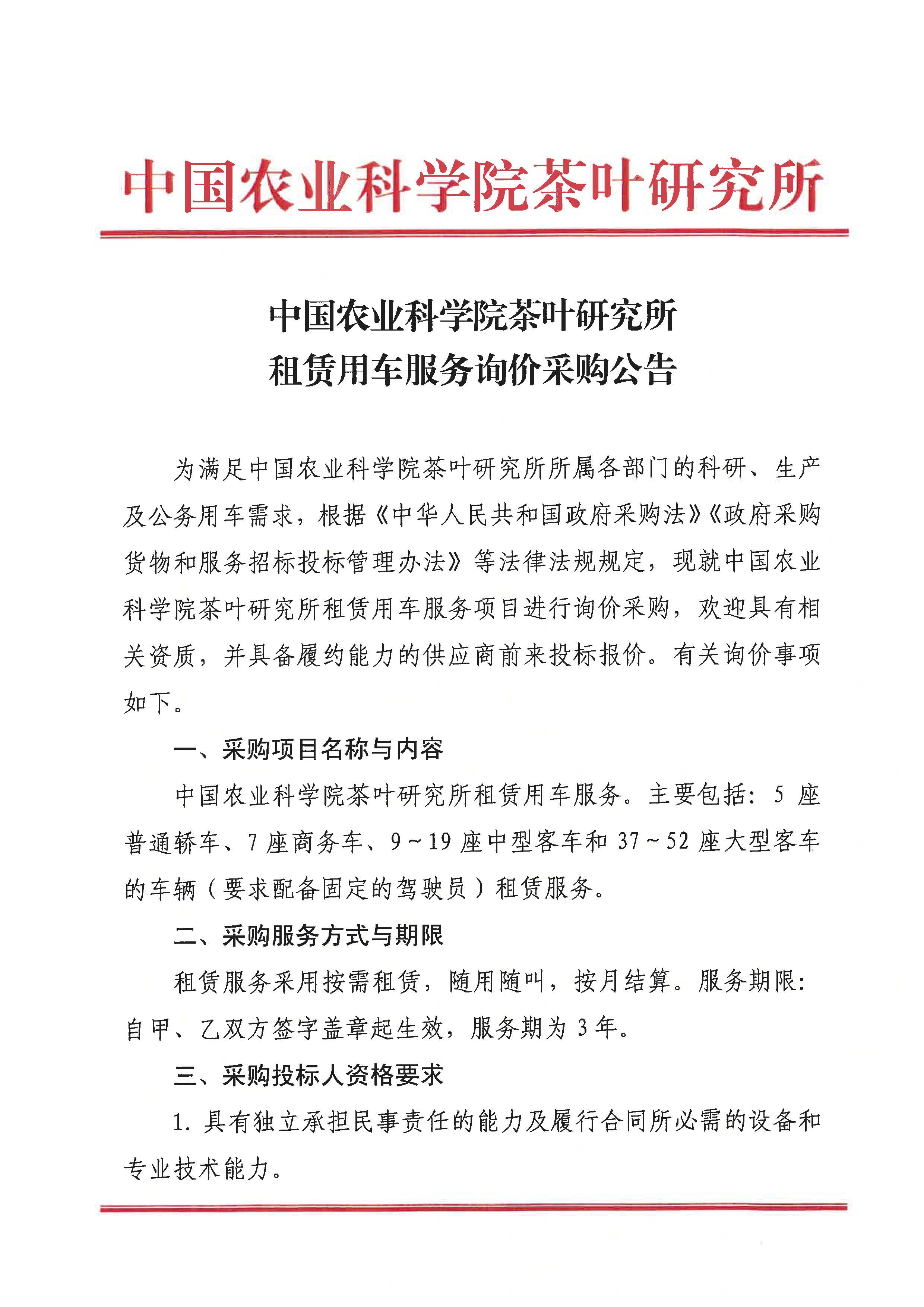 中國農業科學院茶葉研究所租賃用車服務詢價采購公告