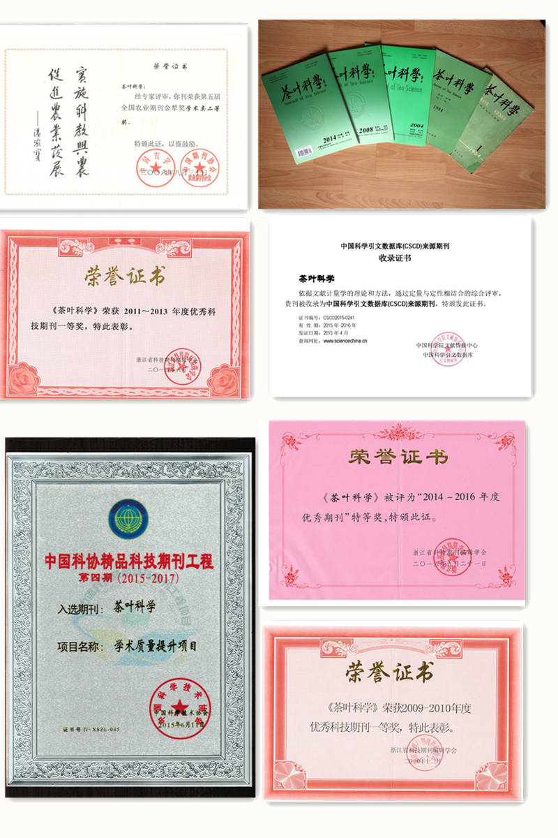 《茶葉科學》是一本能夠反映學科水平和發展動向的茶學學術期刊,是目前國內公認的一級學術期刊(一級學報)。自1989年以來,《茶葉科學》先后被中國科協﹑中國農業科學院﹑中國農學會多次評為優秀學術期刊。自2005年以來,《茶葉科學》連續獲得了浙江省科技期刊編輯學會優秀科技期刊一等獎,2016年《茶葉科學》獲得優秀科技期刊特等獎。2015年《茶葉科學》獲得“中國科協科技期刊精品項目(2015—2017)”項目支持,期刊學術質量得到提升。在中國科學技術協會開展的2016年度核驗和審讀工作中,《茶葉科學》獲得“優”級期刊稱號;《茶葉科學》一直以來就被英國CAB文摘及其數據庫和美國化學文摘CA及其數據庫收錄,加入國內“中國科學引文數據”“中國知網”“萬方數據”“維普”等大型數據庫;2012年《茶葉科學》被中國生物醫學文獻服務系統中的“中國生物醫學文獻數據庫”收錄。2014年被評為“中國農業核心期刊”,并被中國農業核心期刊收錄;2015年在中國學術期刊評價研究報告(武大版)(2015—2016)中被評為“RCCSE中國權威學術期刊(A+)”。《茶葉科學》的各種引證指標一直名列前茅,據CJCR報告,2017年公布結果影響因子達1.118,園藝學學科類排名第二,核心綜合評價總分值達65.80,園藝學學科類排名第三,據CNKI報告,2017年《茶葉科學》影響因子達1.963,期刊影響力指數(CI值)369.899;各項引證指標達歷史新高。